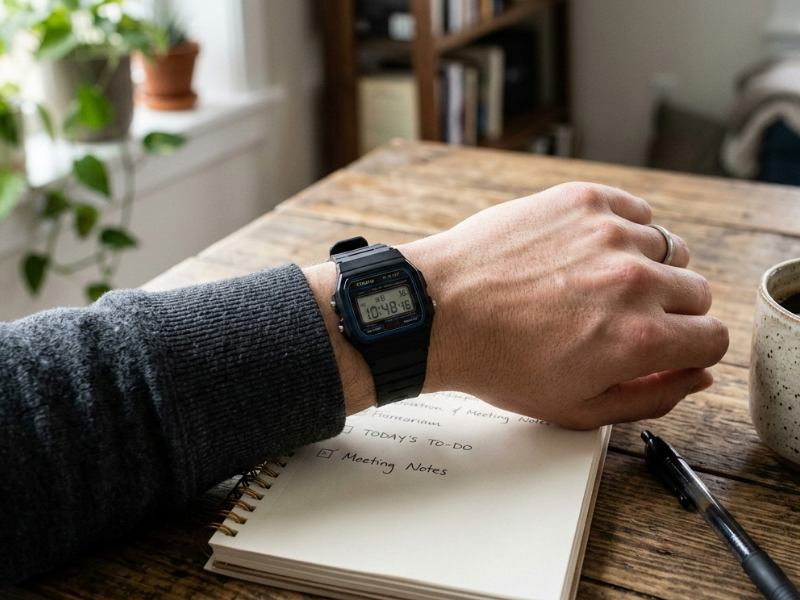 また、仕事の効率という観点でも腕時計には価値があります。タスクの時間管理、会議の進行、移動時間の把握——こうした場面で「チラ見するだけ」で時間がわかることは、仕事のテンポを保つうえで意外と重要です。スマホを取り出す動作が不要になるだけで、集中力の途切れが減ります。
